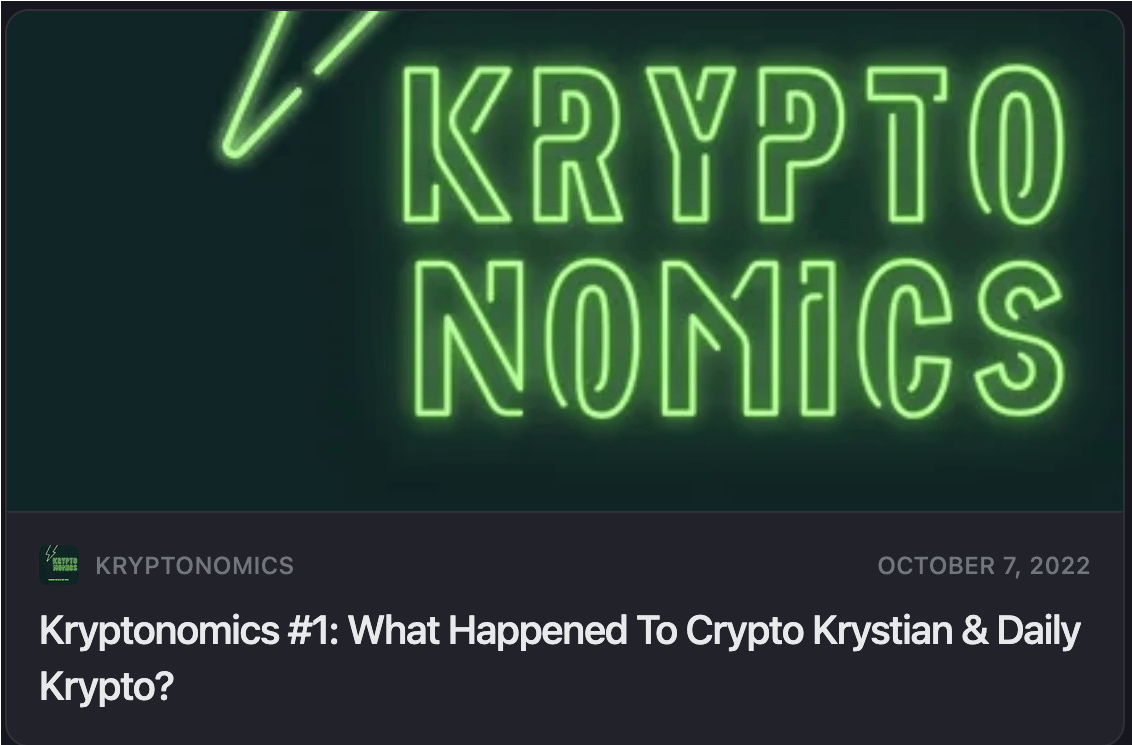 So, if you’re getting this newsletter, its because you’ve either subscribed to my ‘old’ YouTube channel (Crypto Krystian) or my ‘old’ newsletter (Daily Krypto/Kryptonomics)